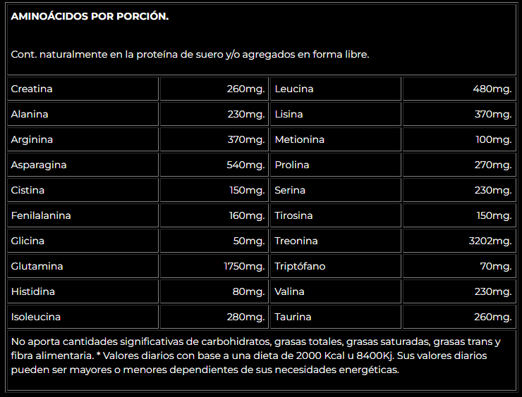 INGREDIENTES: Proteínas de suero de leche, glutamina, arginina, taurina, creatina, antihumectantes: estearato de magnesio, saborizante: sabor vainilla, edulcorante no nutritivo: sucralosa.estabilizantes: polivinilpirrolidona, hu- mectante: propilenglicol. | PRECAUCIONES: Consulte a su medico antes de consumir este producto No utilizar en caso de embarazo, lactancia, ni en niños. Mantener fuera del alcance de los niños. . Este producto está indicado para personas que realizan una actividad física que requiere un aporte de calorías diarias superior al promedio de la población (2000 kcal. /día). Su consumo debe realizarse bajo estricto control medico. Contiene 345mg de sucralos por cada 100gr de producto.