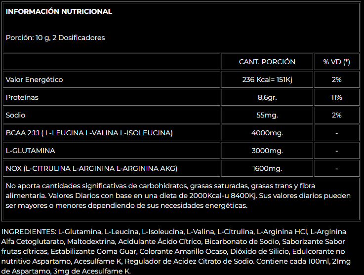 AMINO PRO es una fórmula en polvo de BCAA (aminoácidos de cadena ramificada), con el agregado de Glutamina y precursores de Óxido Nítrico. Tiene una fácil dilución y consumo debido a su presentación en polvo. Con efecto inmediato, puede ser consumido a diario sin períodos de descanso. Ideal para consumir durante y post entrenamiento.